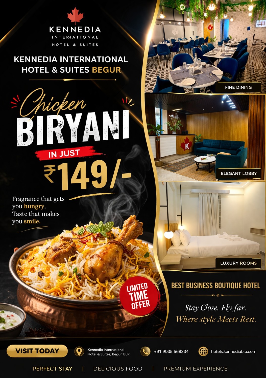 " Kennedia Hotel Bangalore offers a perfect blend of comfort and luxury. The ambiance is elegant, and the rooms are well-maintained with top-class facilities. The staff is professional, friendly, and provides quick service. Its prime location in Bangalore makes it ideal for corporate travelers and tourists alike. The dining experience was fantastic, with delicious food and great presentation. I would definitely choose this hotel again for my next visit! "